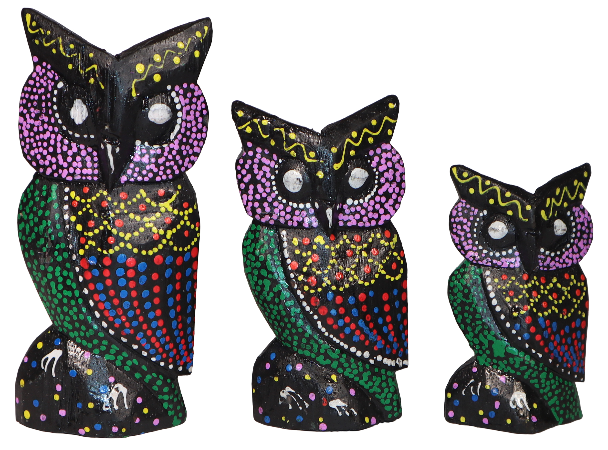 Figurka sowy wykonana z drewna, ręcznie malowana, importowana z Indonezji (Bali).