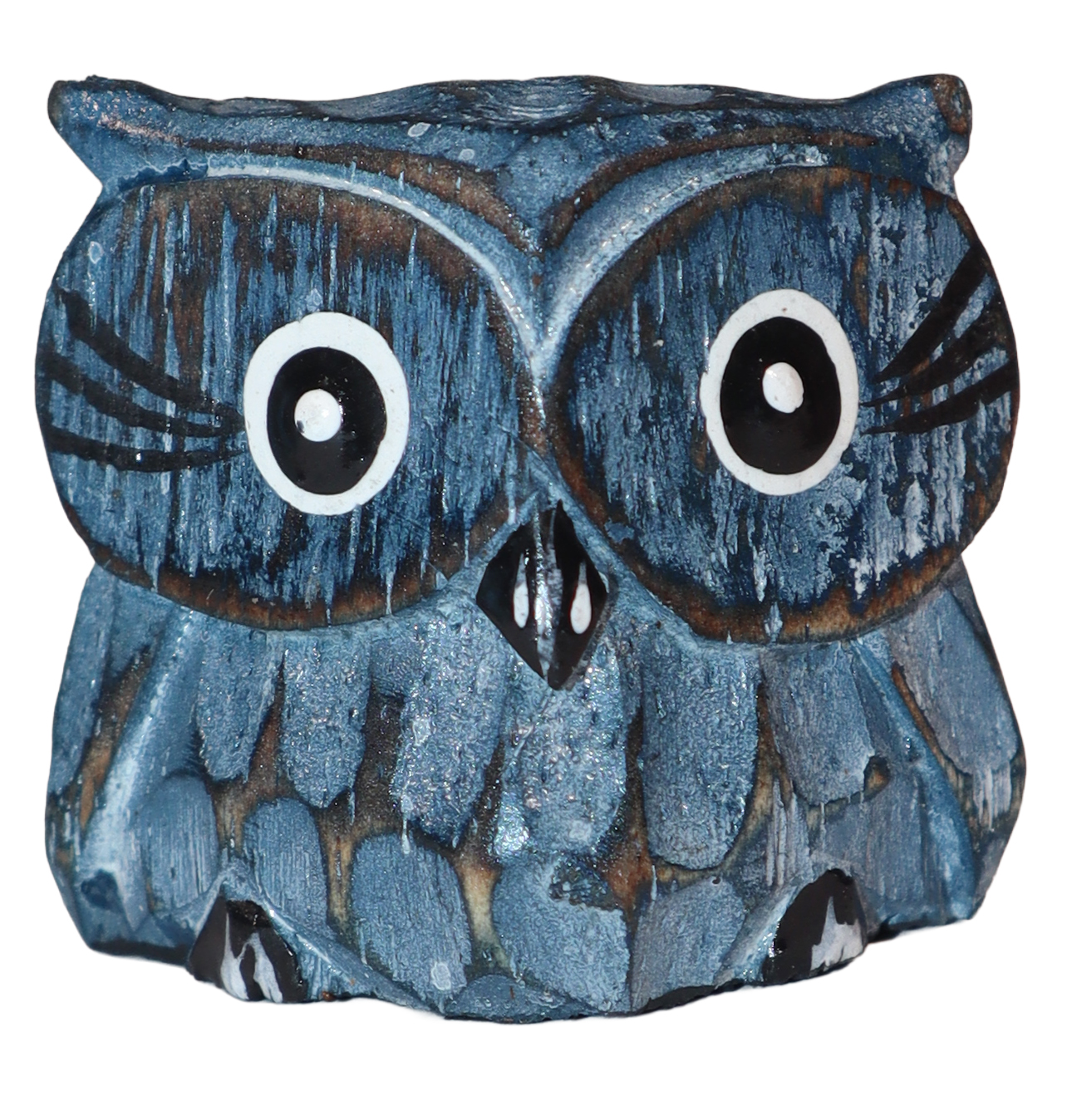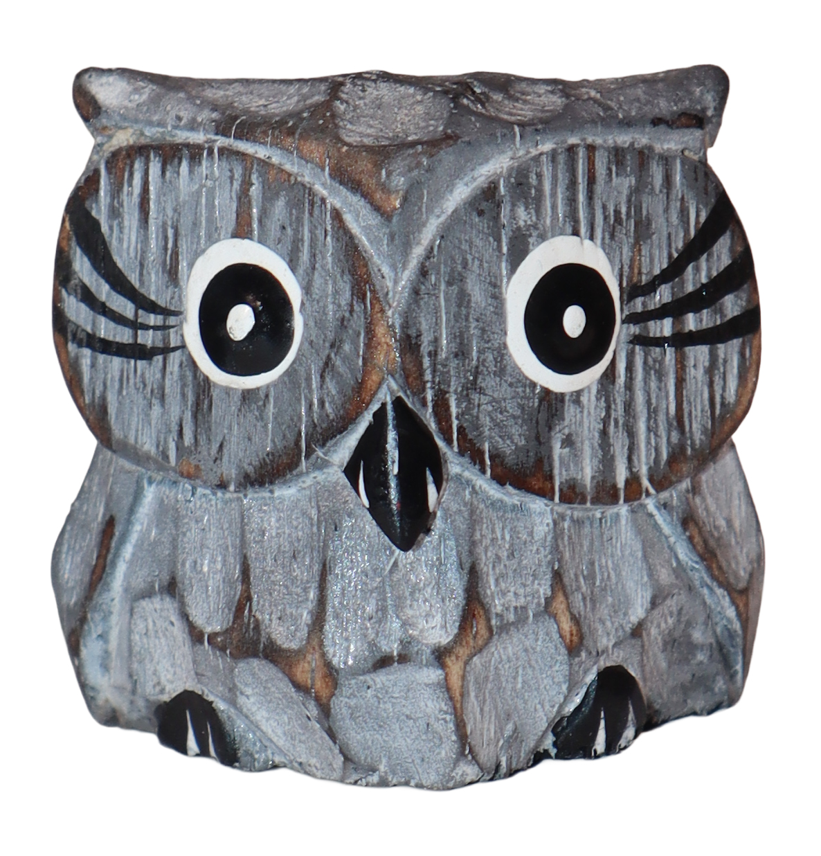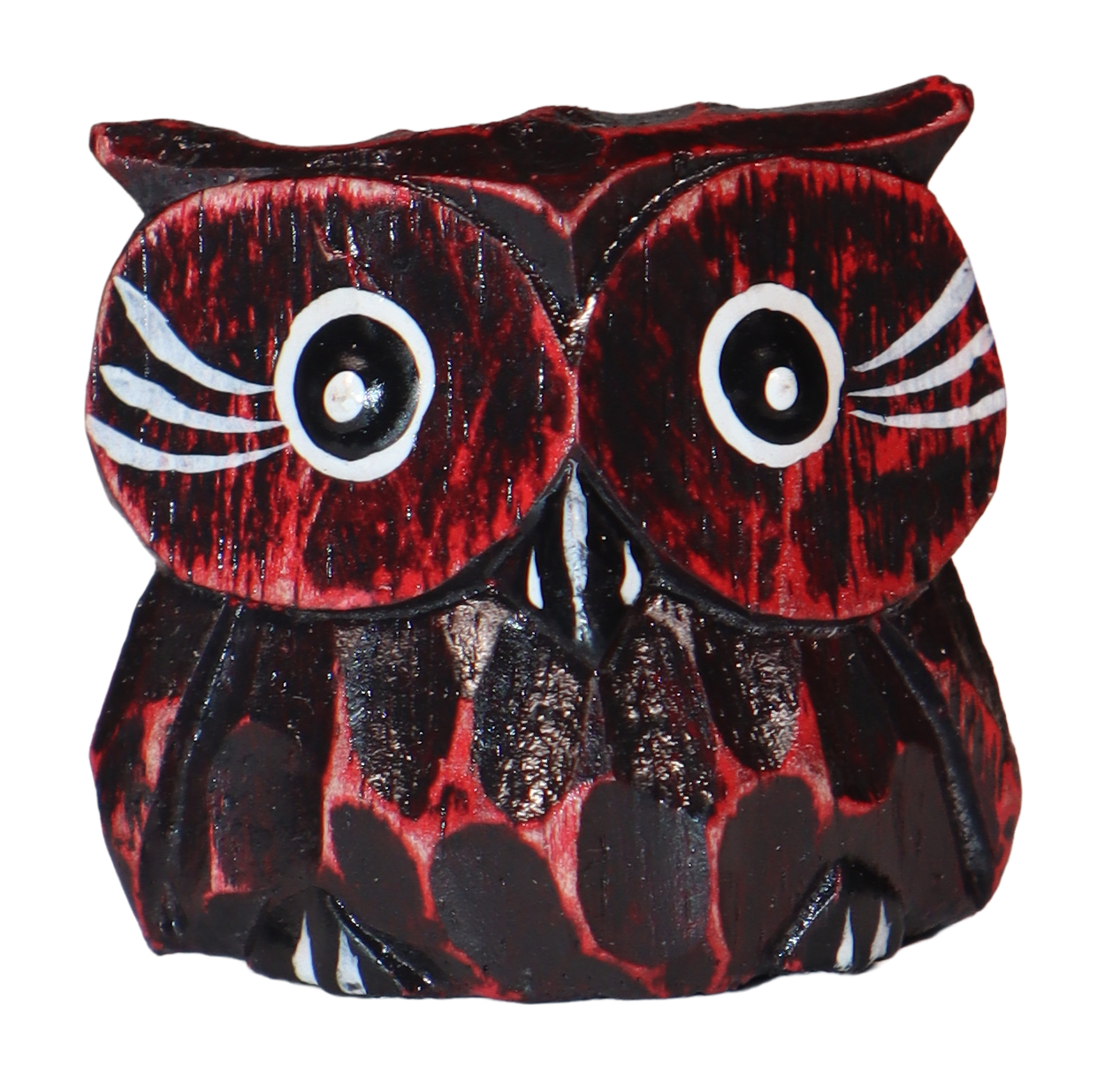 Figurka sowy wykonana z drewna, ręcznie malowana, importowana z Indonezji (Bali).