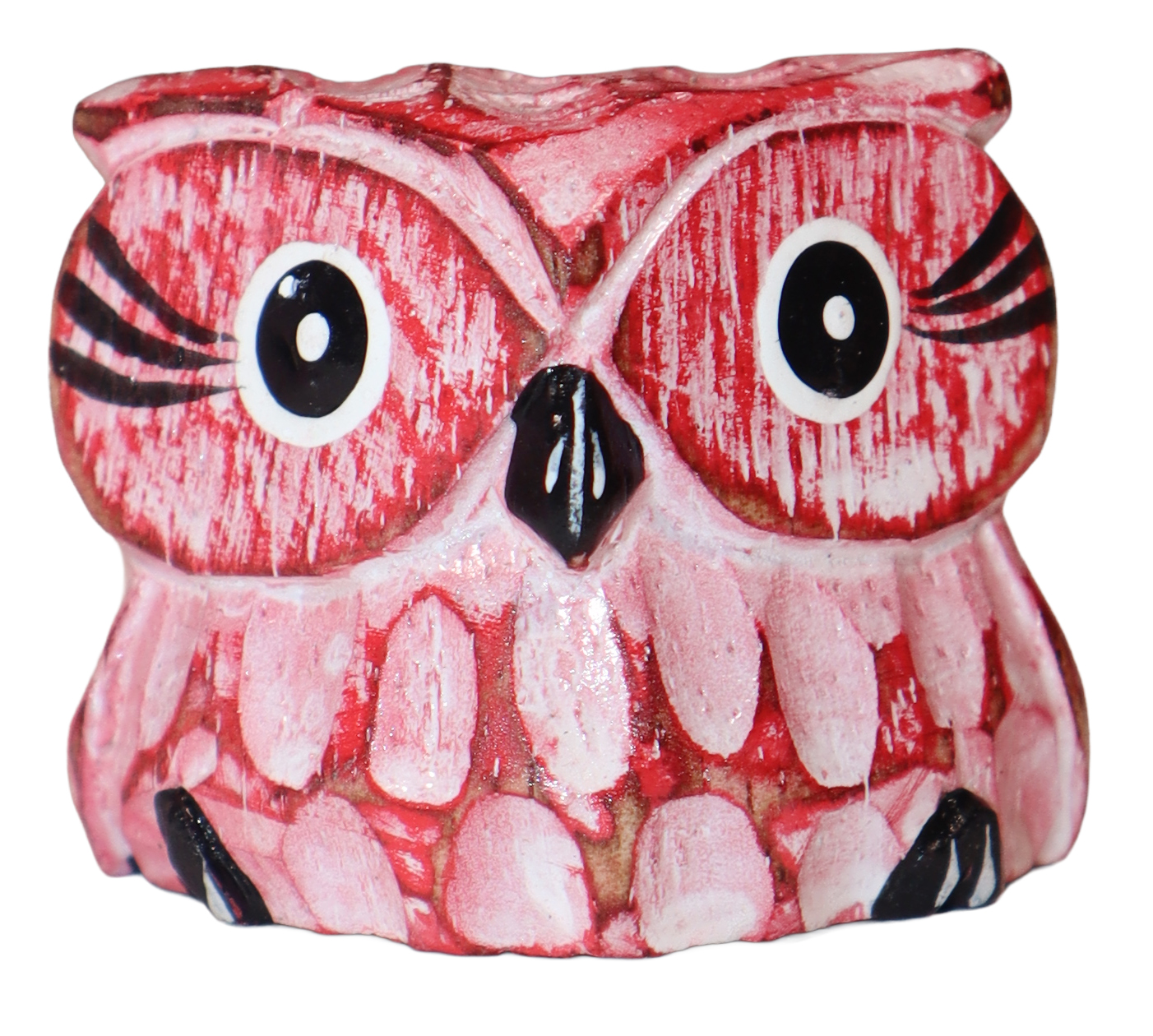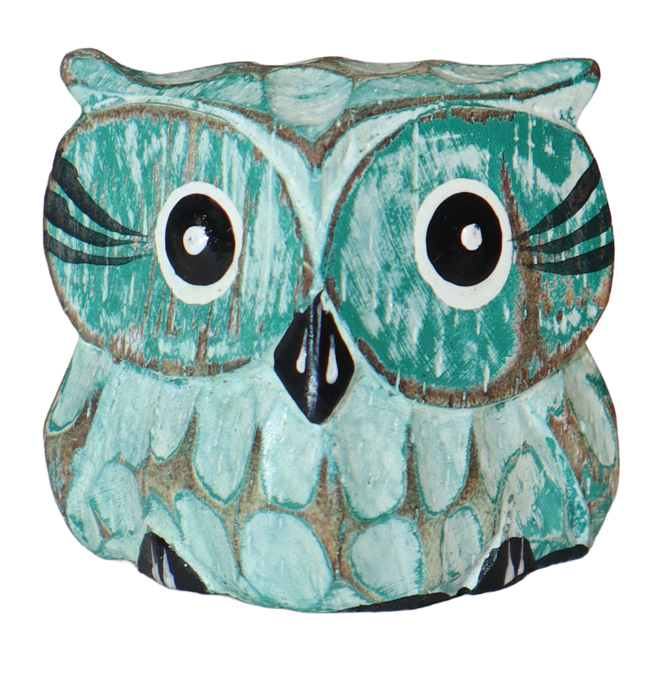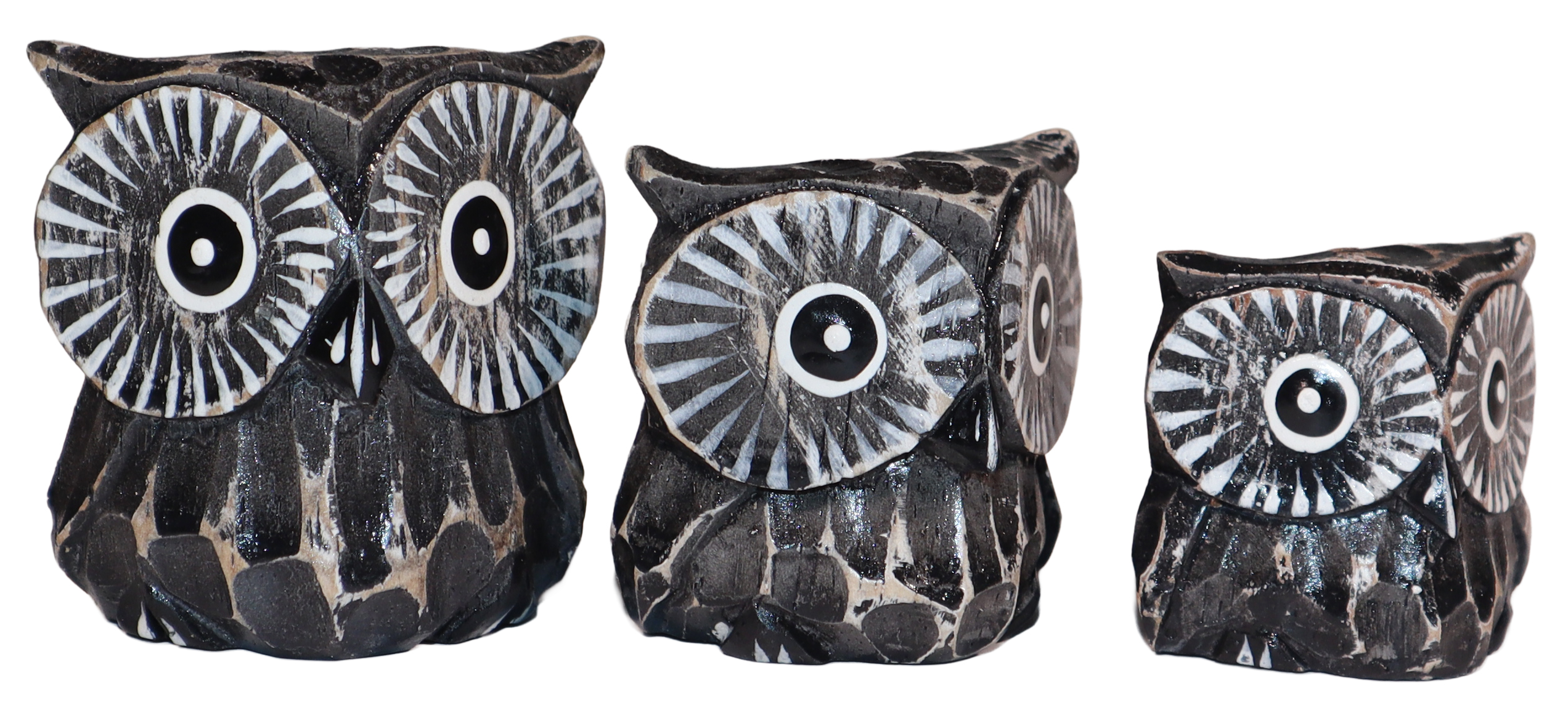 Figurka sowy wykonana z drewna, ręcznie malowana, importowana z Indonezji (Bali).
