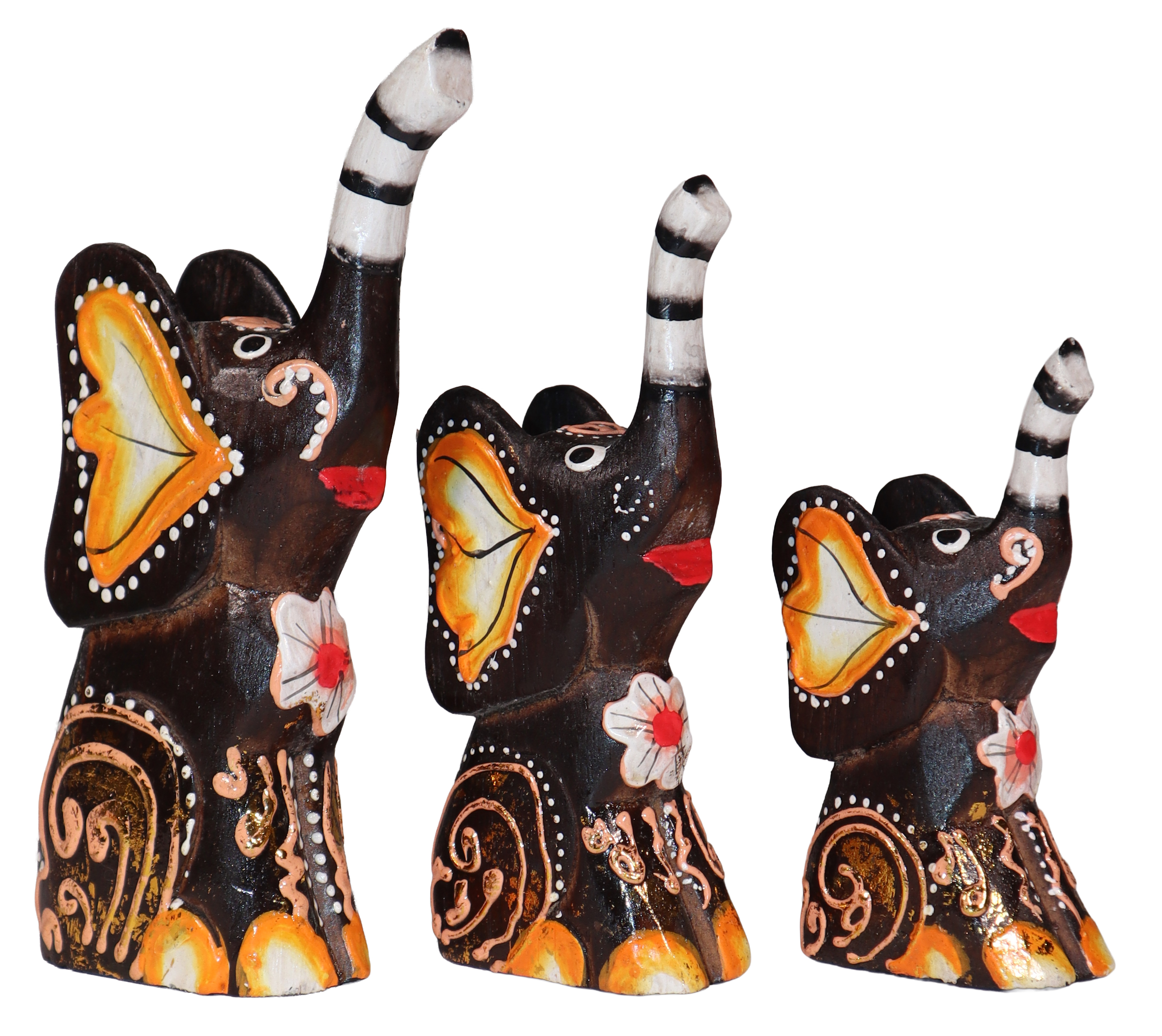 Zestaw trzech słoni z drewna - wys. 14 cm, 16 cm, 18 cm / 3 kolory