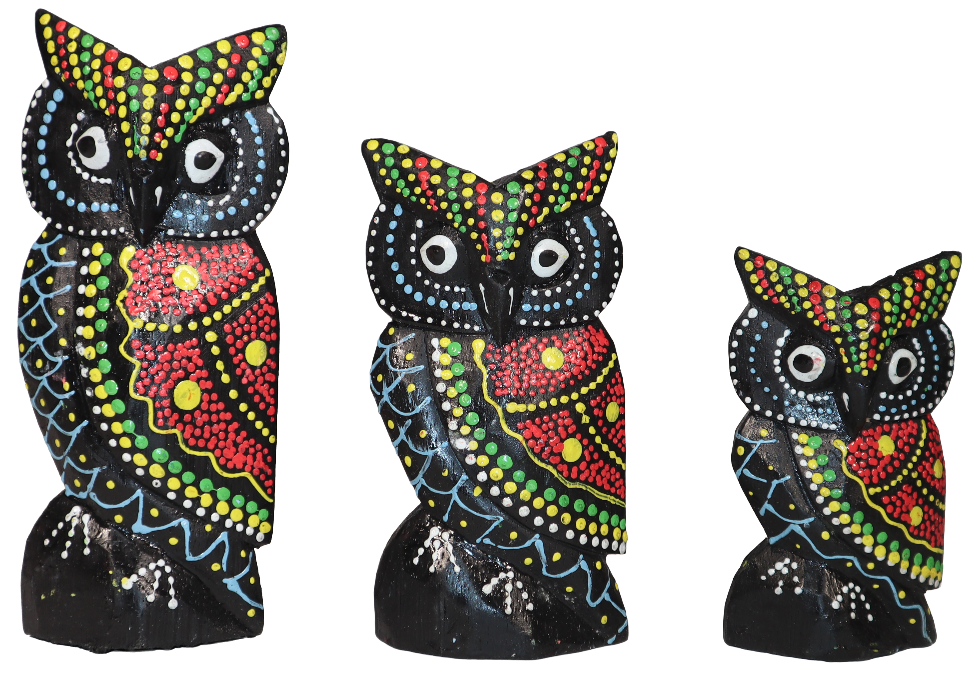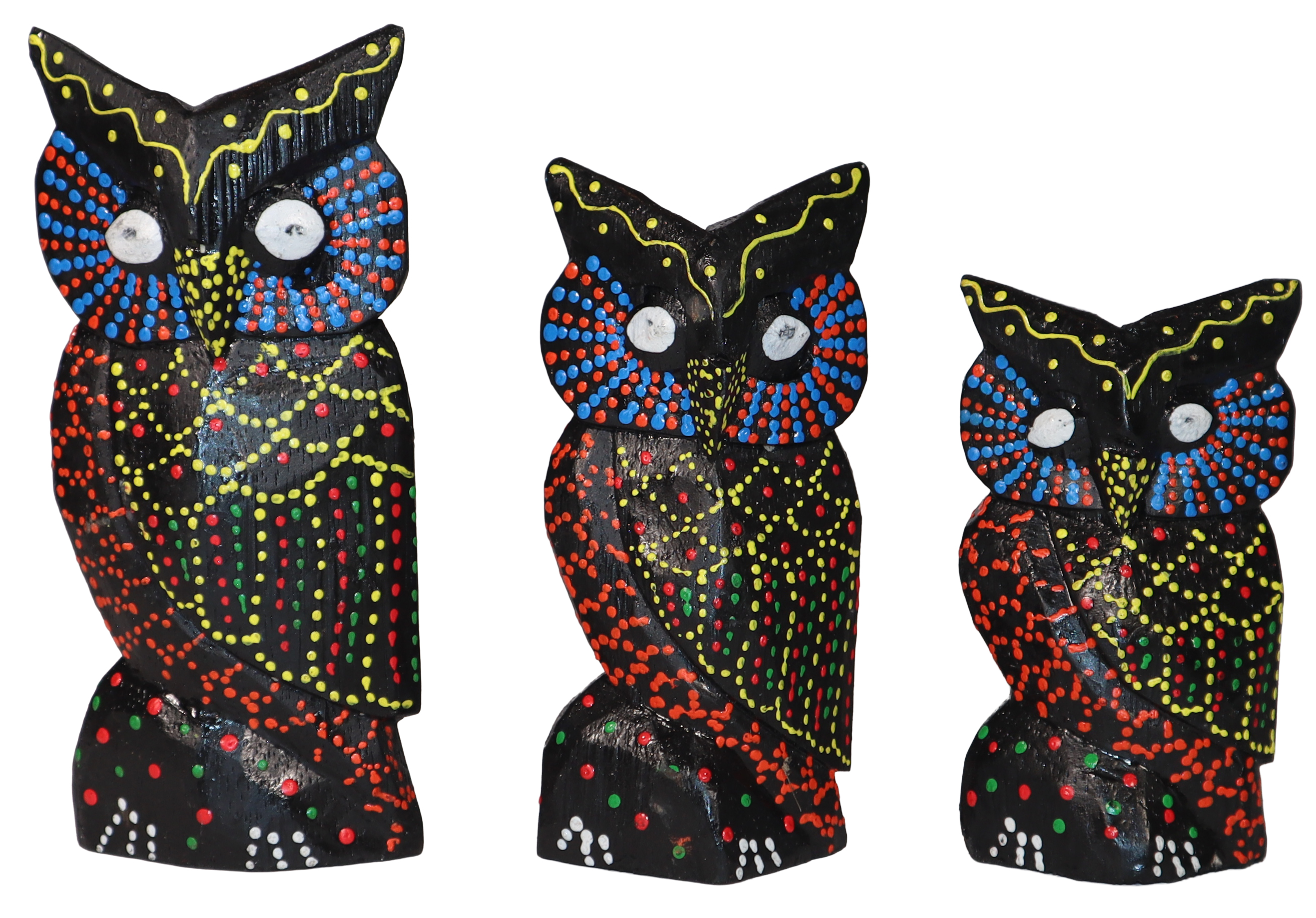Komplet trzech sów wykonanych z drewna, ręcznie malowanych, import z Indonezji (Bali).